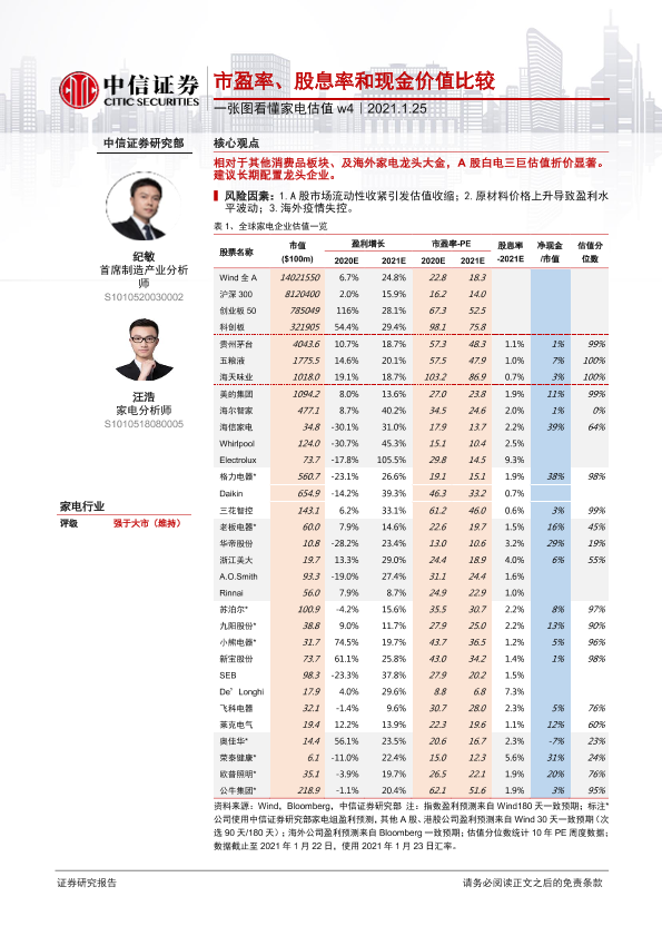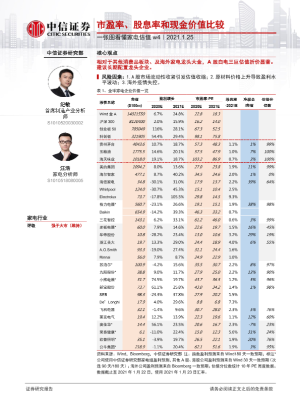 【中信证券】【20210125】一张图看懂家电估值w4:市盈率、股息率和现金价值比较-2页