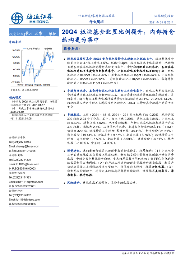 【海通证券】【20210125】家用电器与器具行业周报:20Q4板块基金配置比例提升,内部持仓结构更为集中-8页