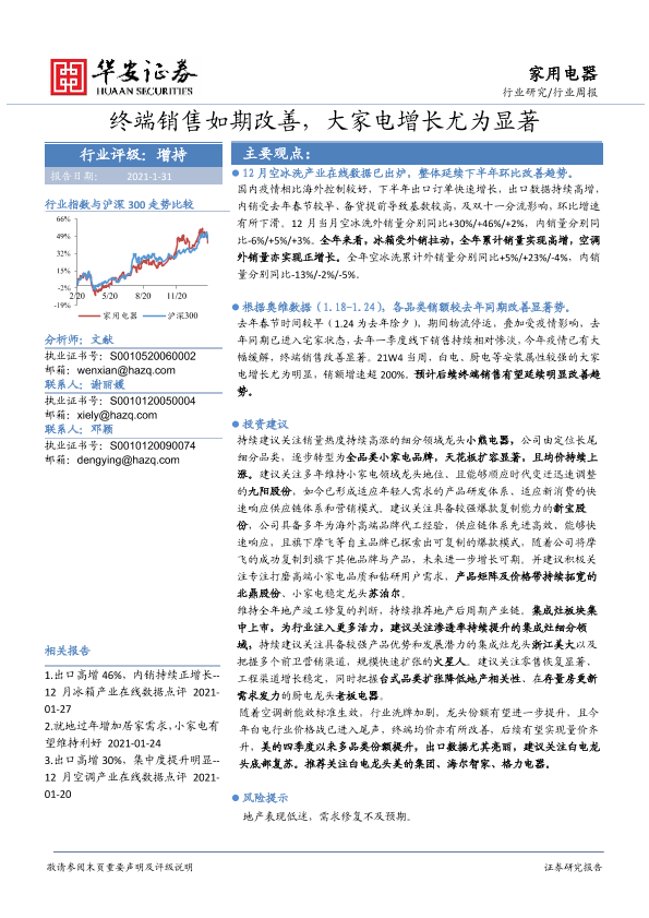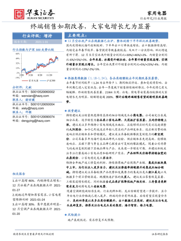 【华安证券】【20210131】家用电器行业周报:终端销售如期改善,大家电增长尤为显著-16页