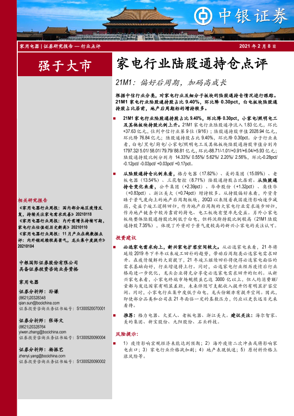 【中银证券】【20210208】20210208-中银证券-家电行业陆股通持仓点评:21M1:偏好后周期,加码高成长-13页