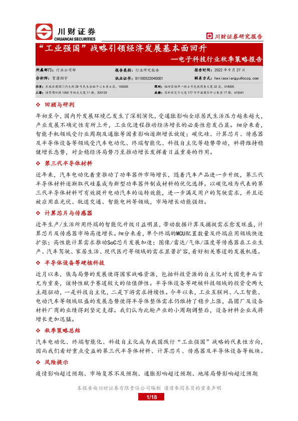 【川财证券】【20220927】电子科技行业秋季策略报告:“工业强国”战略引领经济发展基本面回升-18页