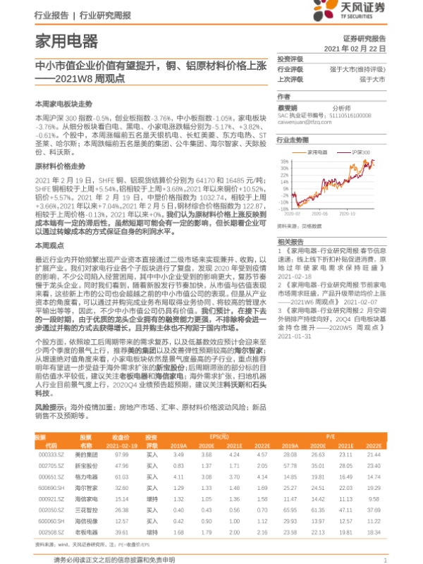 【天风证券】【20210222】家用电器周观点:中小市值企业价值有望提升,铜、铝原材料价格上涨-12页
