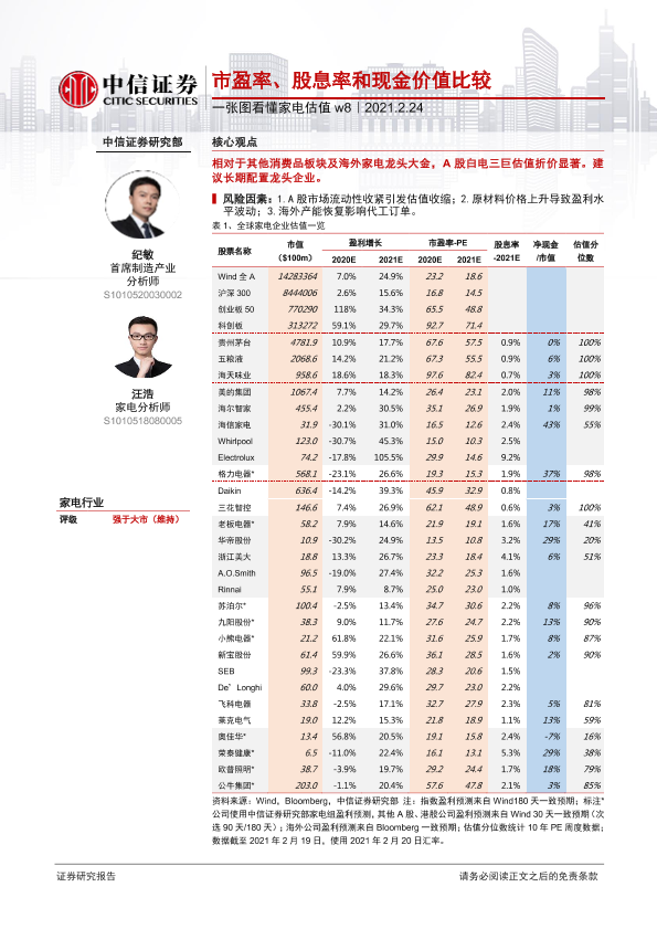 【中信证券】【20210224】一张图看懂家电估值w8:市盈率、股息率和现金价值比较-2页