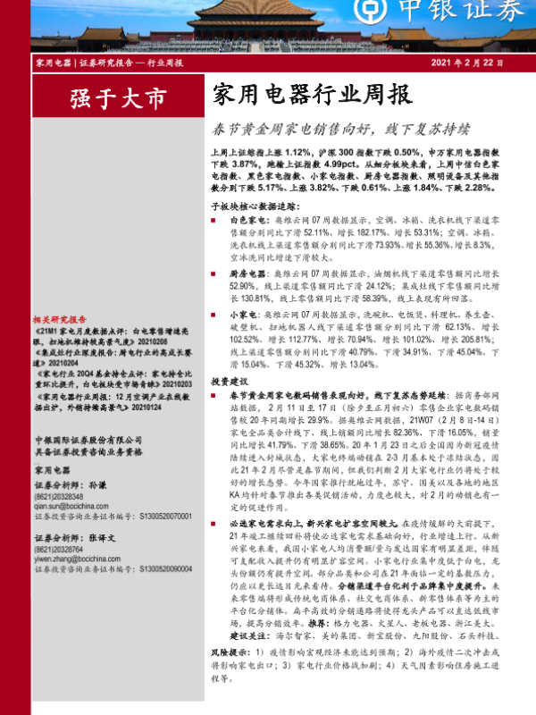 【中银证券】【20210222】20210222-中银证券-家用电器行业周报:春节黄金周家电销售向好,线下复苏持续-32页