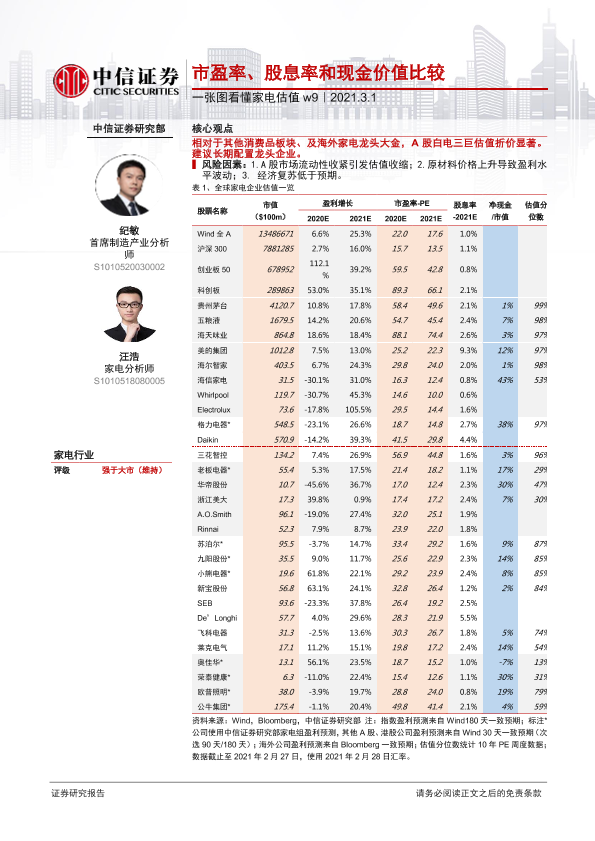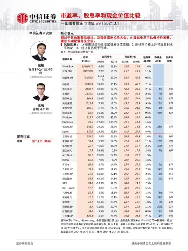 【中信证券】【20210301】一张图看懂家电估值w9:市盈率、股息率和现金价值比较-2页