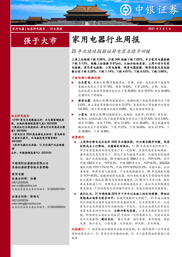 【中银证券】【20210301】20210301-中银证券-家用电器行业周报:20年业绩快报验证厨电需求稳步回暖-32页