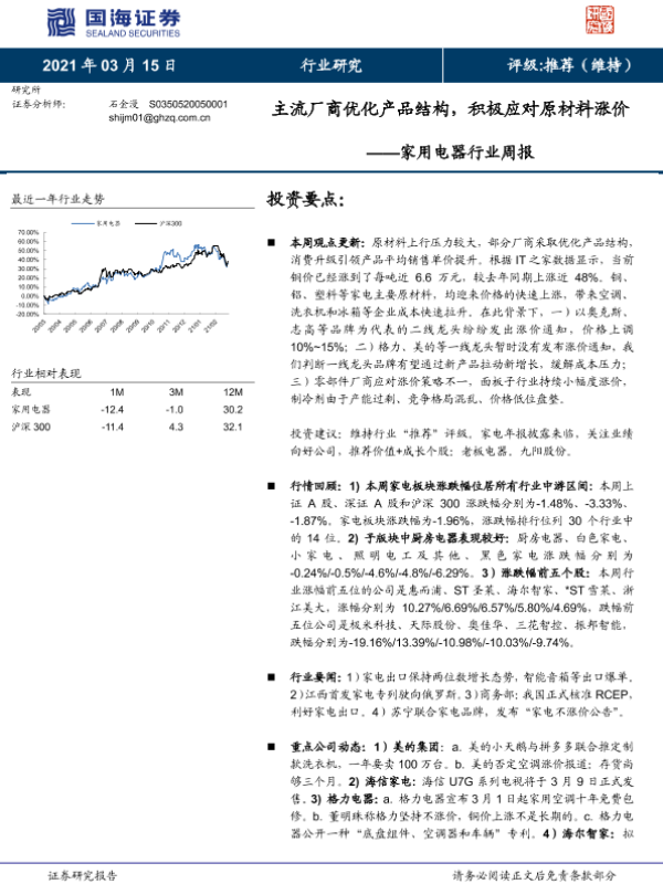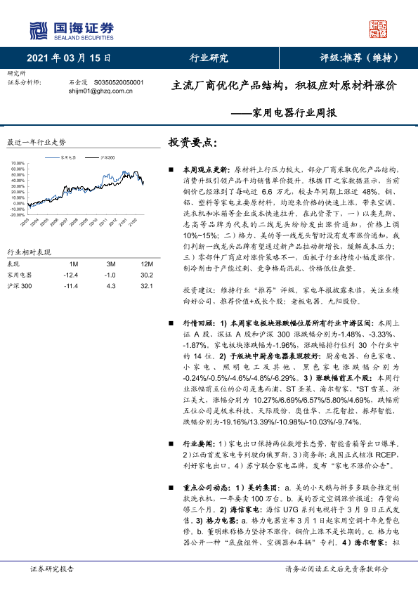 【国海证券】【20210315】家用电器行业周报:主流厂商优化产品结构,积极应对原材料涨价-13页