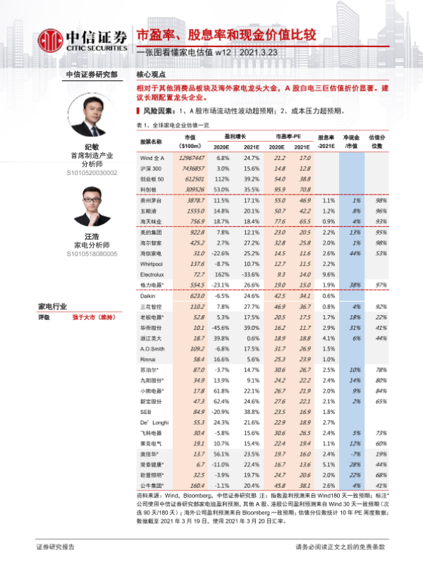 【中信证券】【20210323】一张图看懂家电估值w12-市盈率、股息率和现金价值比较-2页