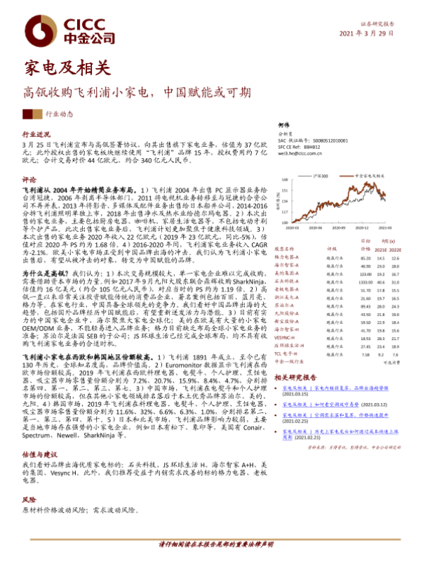 【中金公司】【20210329】家电及相关行业动态:高瓴收购飞利浦小家电,中国赋能或可期-6页
