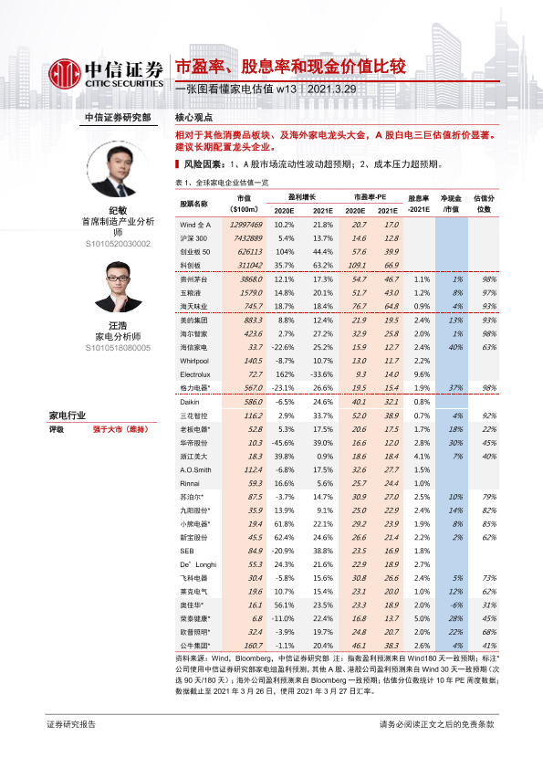 【中信证券】【20210329】20210329-中信证券-一张图看懂家电估值w13:市盈率、股息率和现金价值比较-2页