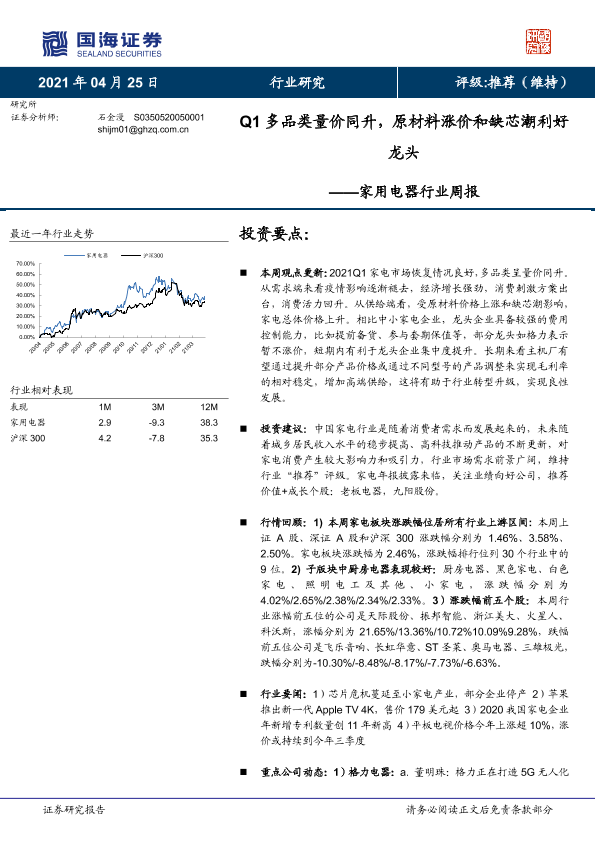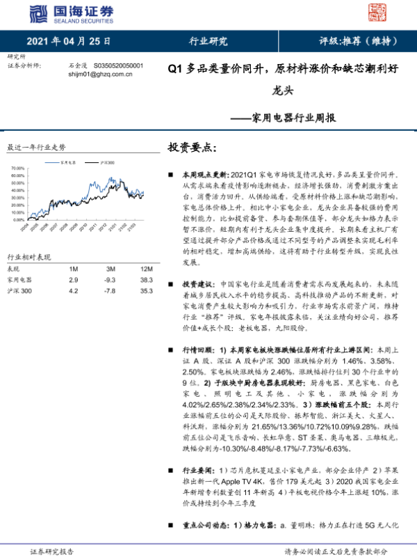 【国海证券】【20210425】20210425-国海证券-家用电器行业周报:Q1多品类量价同升,原材料涨价和缺芯潮利好龙头-14页