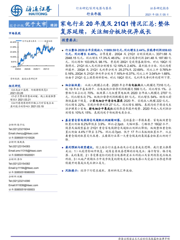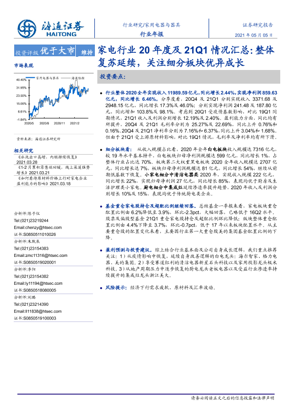 【海通证券】【20210505】家电行业20年度及21Q1情况汇总:整体复苏延续,关注细分板块优异成长-24页