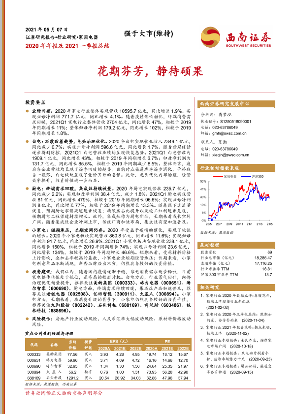 【西南证券】【20210507】家用电器2020年年报及2021年一季报总结:花期芬芳,静待硕果-23页