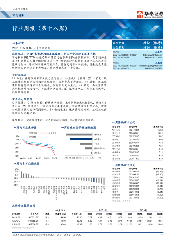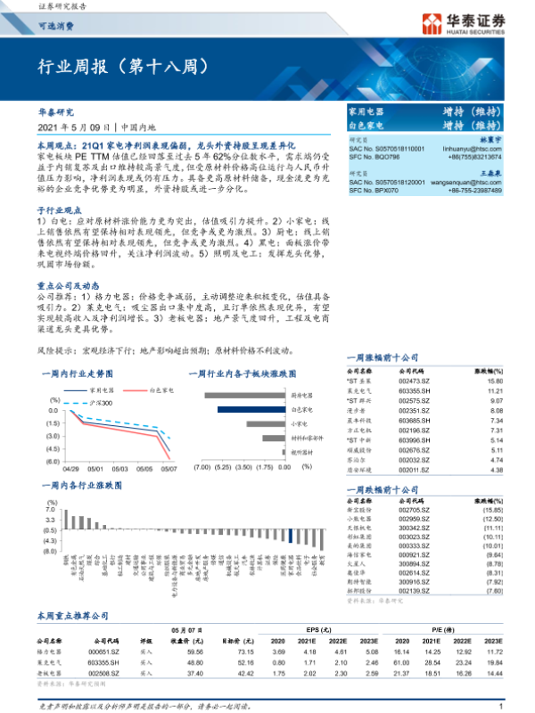 【华泰证券】【20210509】20210509-华泰证券-家用电器行业周报(第十八周)-16页