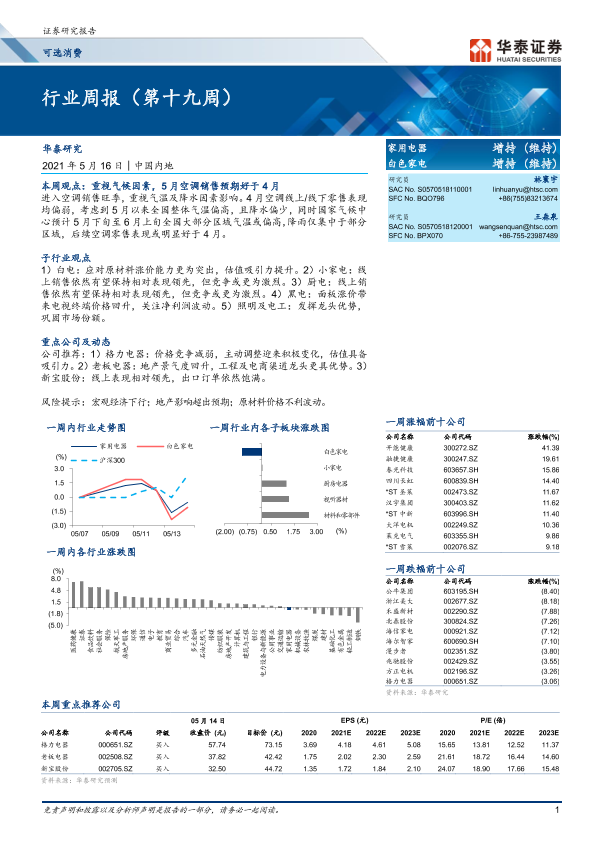 【华泰证券】【20210516】20210516-华泰证券-家用电器行业周报(第十九周)-14页