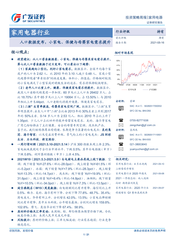 【广发证券】【20210516】20210516-广发证券-家用电器行业投资策略周报:人口数据发布,小家电、保健与母婴家电需求提升-21页