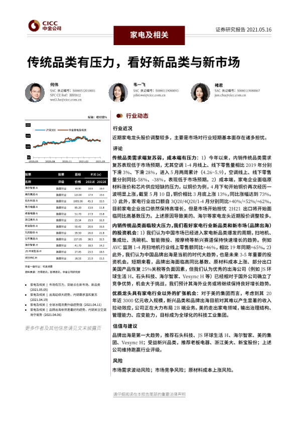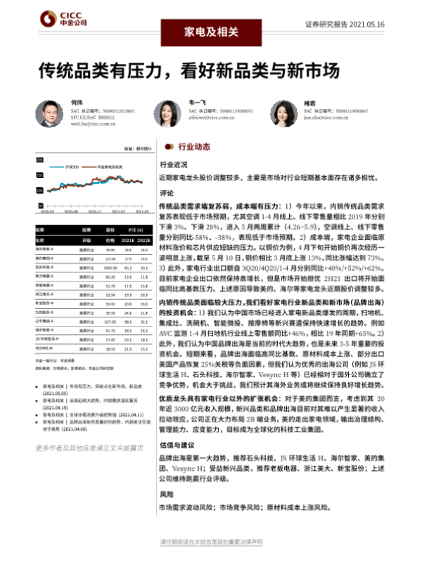 【中金公司】【20210516】20210516-中金公司-家电及相关行业动态:传统品类有压力,看好新品类与新市场-9页