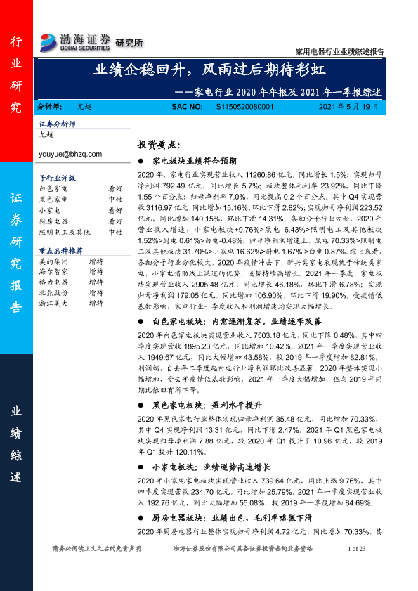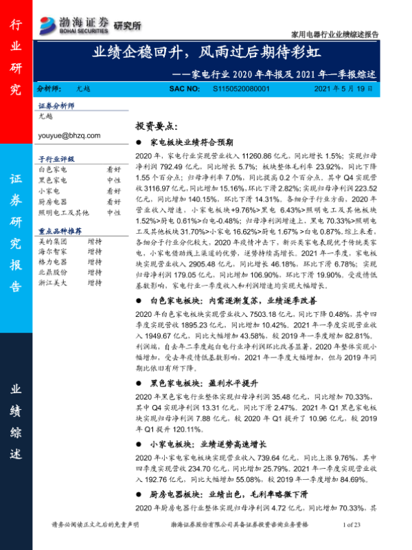 【渤海证券】【20210519】家电行业2020年年报及2021年一季报综述:业绩企稳回升,风雨过后期待彩虹-23页