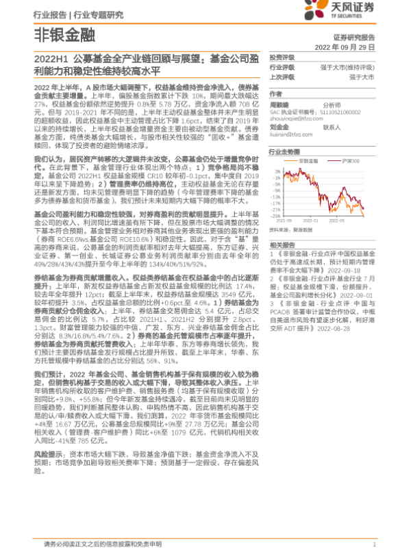 【天风证券】【20220929】非银金融行业专题研究:2022H1公募基金全产业链回顾与展望:基金公司盈利能力和稳定性维持较高水平-27页