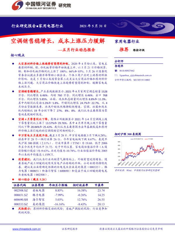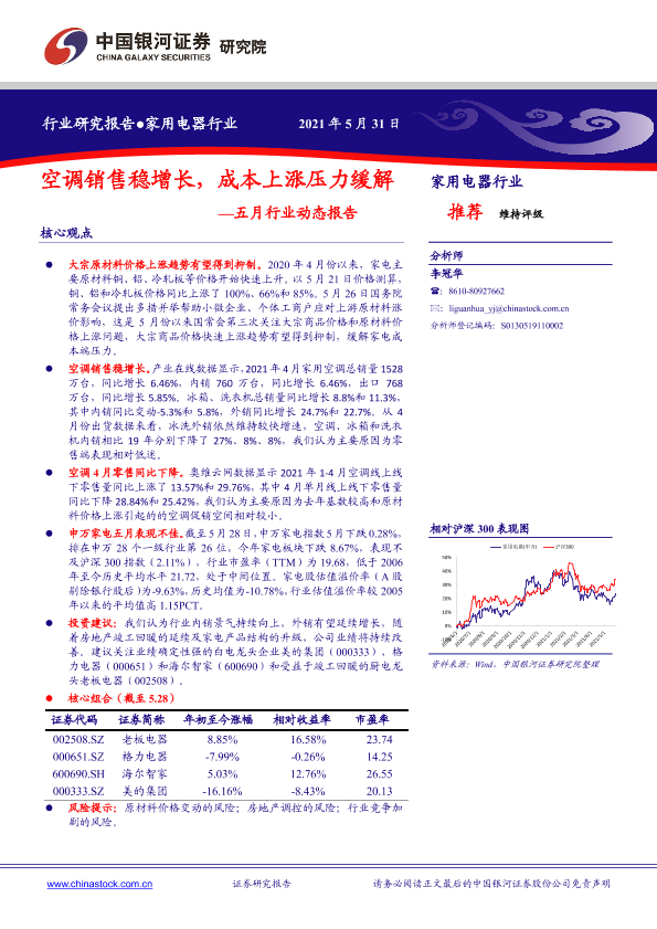 【银河证券】【20210531】家用电器行业五月行业动态报告:空调销售稳增长,成本上涨压力缓解-26页