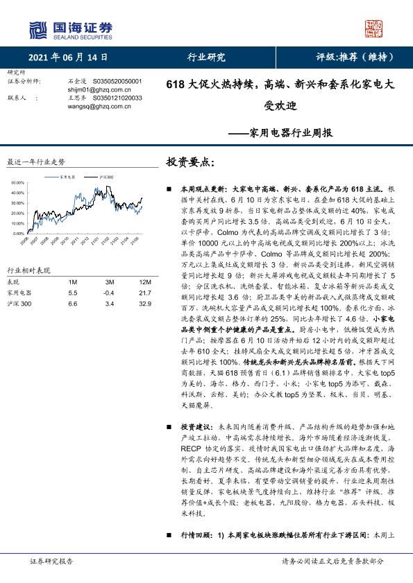 【国海证券】【20210614】家用电器行业周报:618大促火热持续,高端、新兴和套系化家电大受欢迎-13页