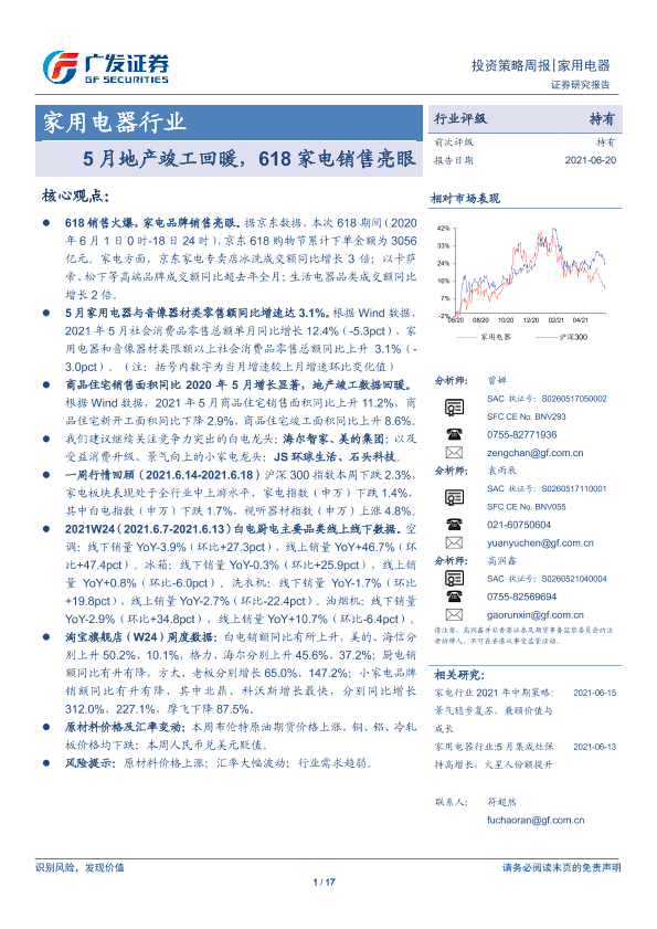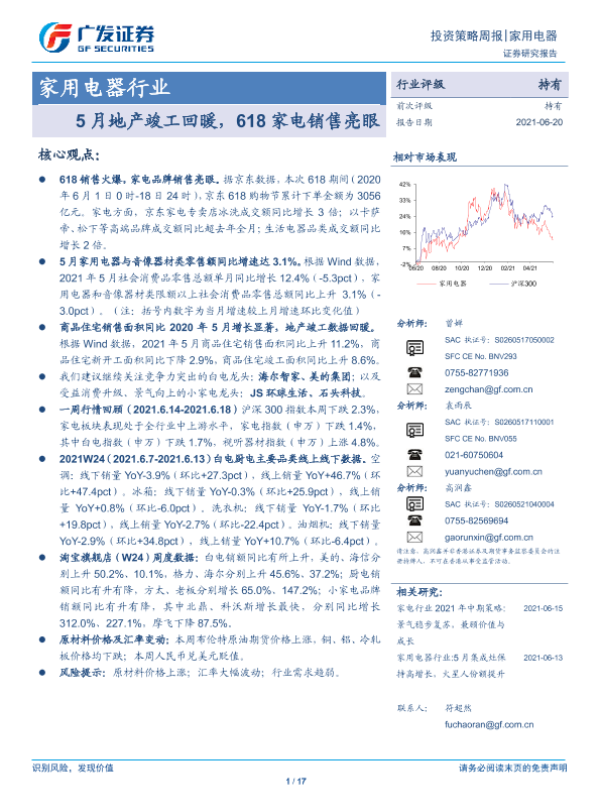 【广发证券】【20210620】20210620-广发证券-家用电器行业投资策略周报:5月地产竣工回暖,618家电销售亮眼-17页