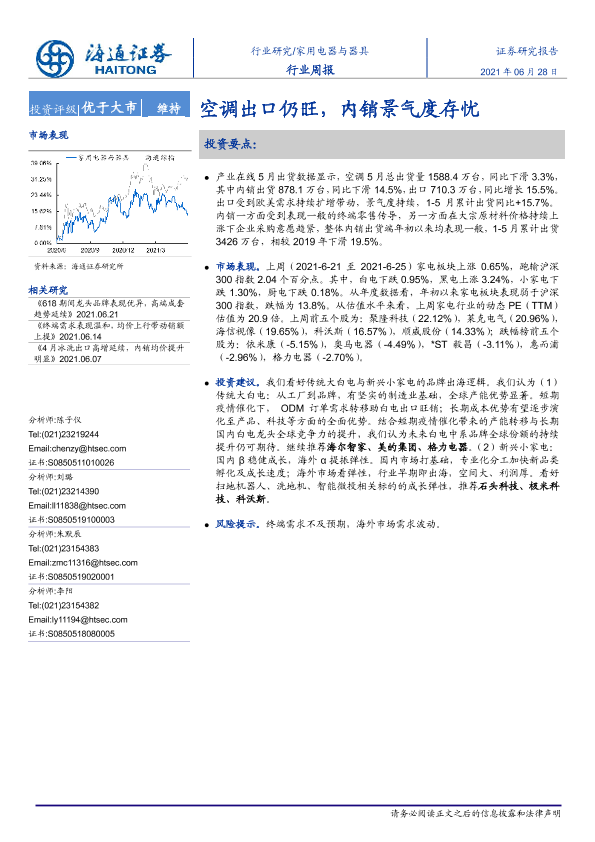 【海通证券】【20210628】家用电器与器具行业周报:空调出口仍旺,内销景气度存忧-5页
