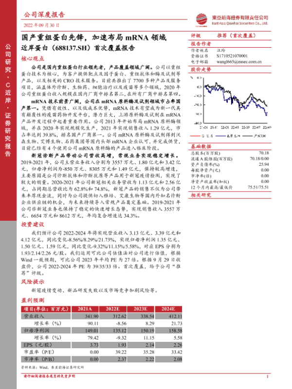 【东亚前海证券】【20220928】首次覆盖报告:国产重组蛋白先锋,加速布局mRNA领域-28页