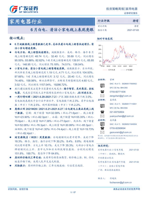 【广发证券】【20210703】20210703-广发证券-家用电器行业投资策略周报:6月白电、清洁小家电线上表现亮眼-17页