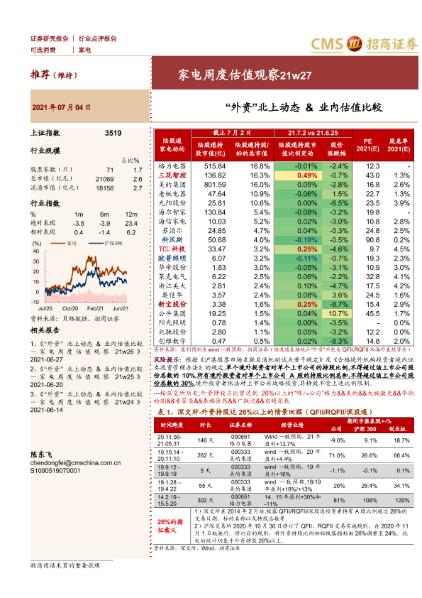 【海通证券】【20210704】家电周度估值观察:“外资”北上动态&业内估值比较-3页