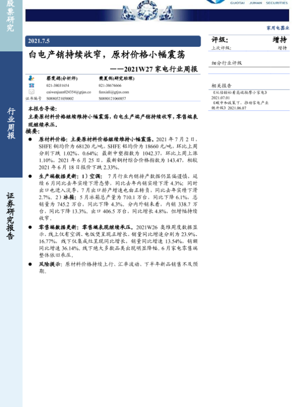 【国泰君安证券】【20210705】2021W27家电行业周报:白电产销持续收窄,原材价格小幅震荡-8页