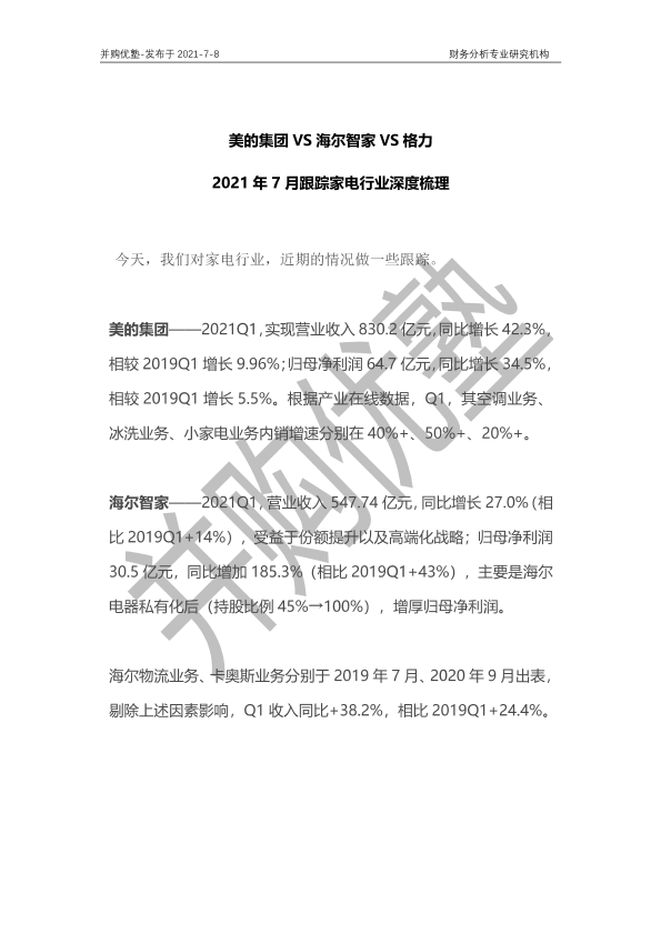 【并购优塾】【20210708】2021年7月跟踪家电行业深度梳理-36页