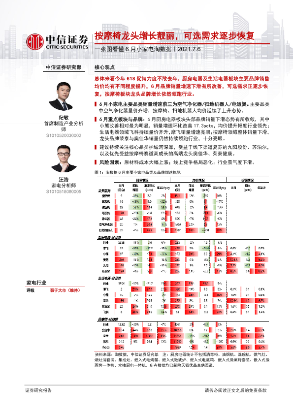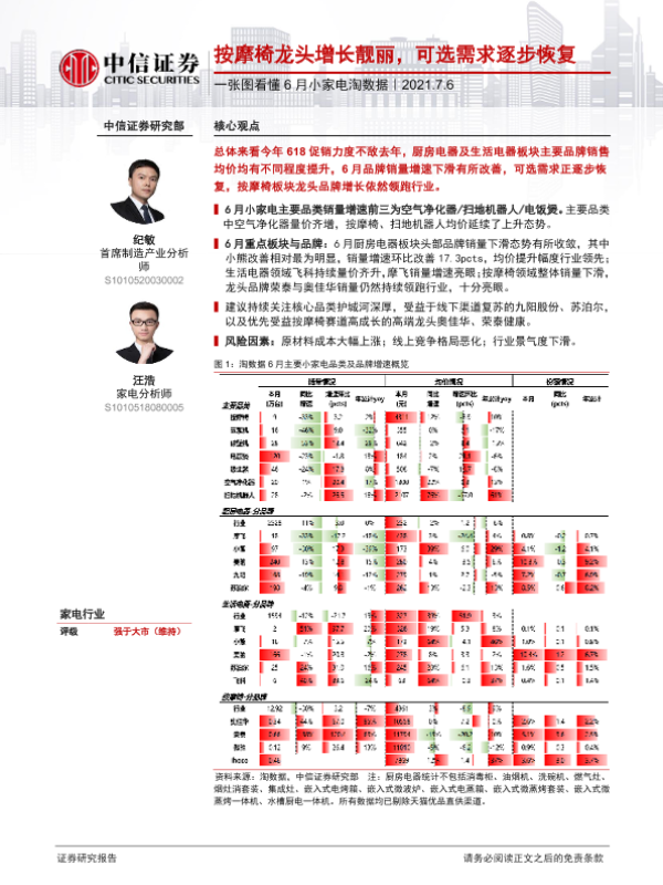 【中信证券】【20210706】一张图看懂6月小家电淘数据:按摩椅龙头增长靓丽,可选需求逐步恢复-2页