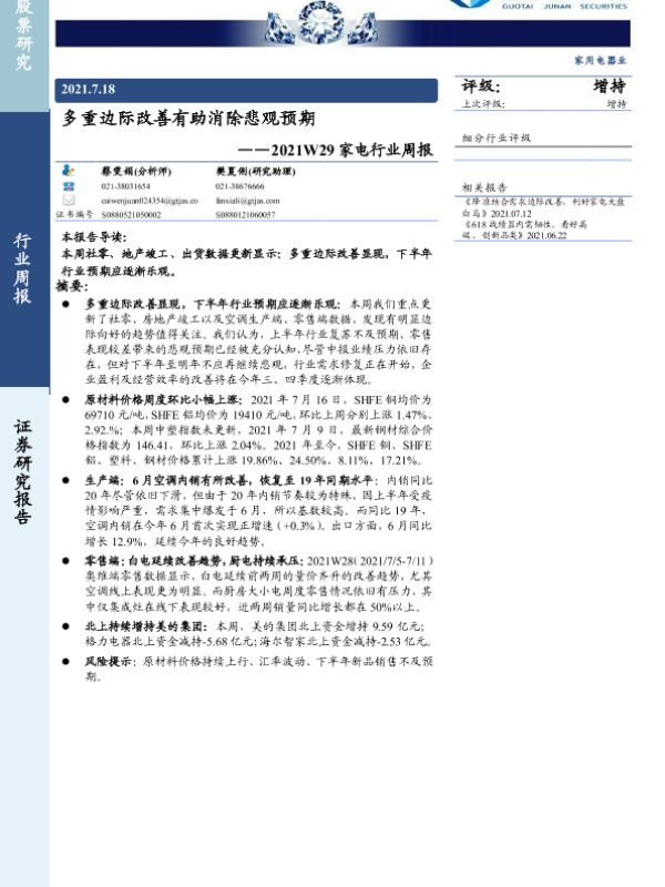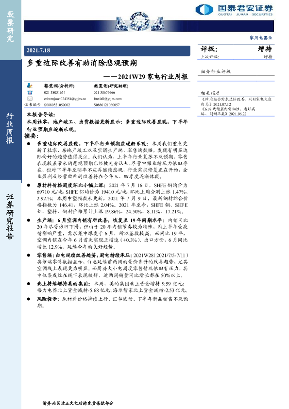 【国泰君安证券】【20210718】2021W29家电行业周报:多重边际改善有助消除悲观预期-13页