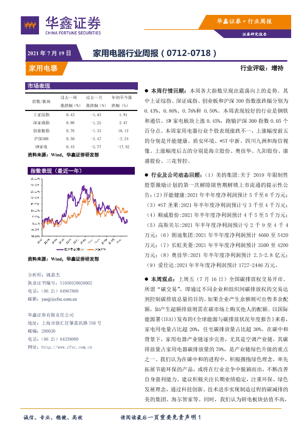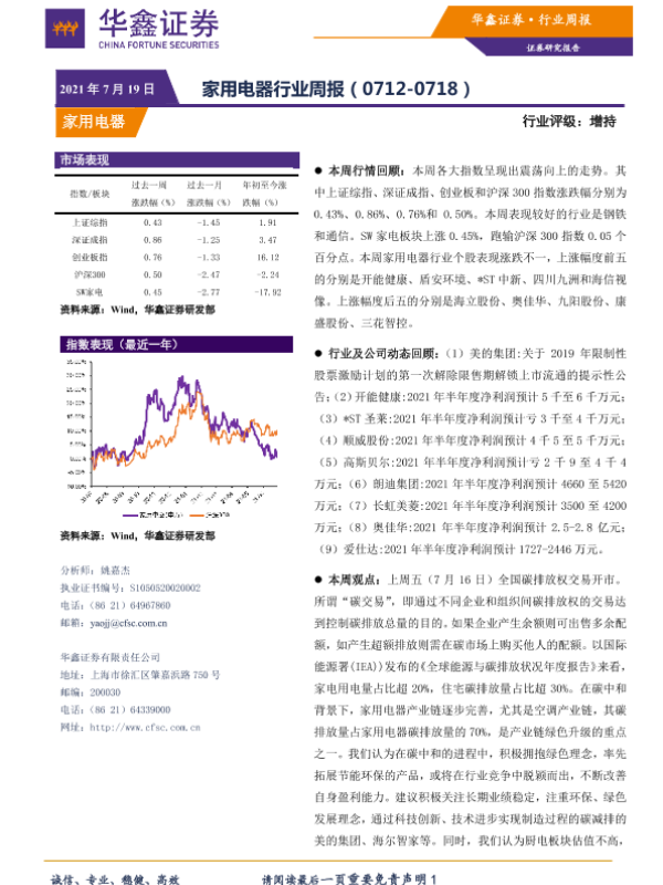 周报 家用电器 碳交易 股市分析 行业动态