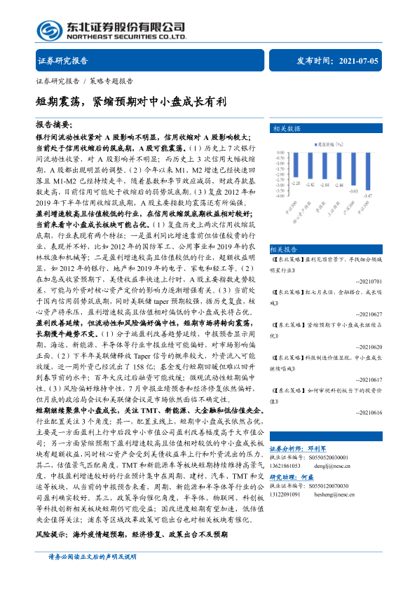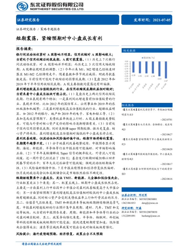 【东北证券】【20210705】策略专题报告:短期震荡,紧缩预期对中小盘成长有利-29页