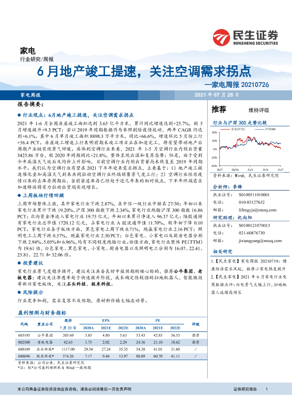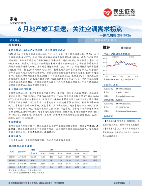 【民生证券】【20210726】20210726-民生证券-家电周报:6月地产竣工提速,关注空调需求拐点-14页