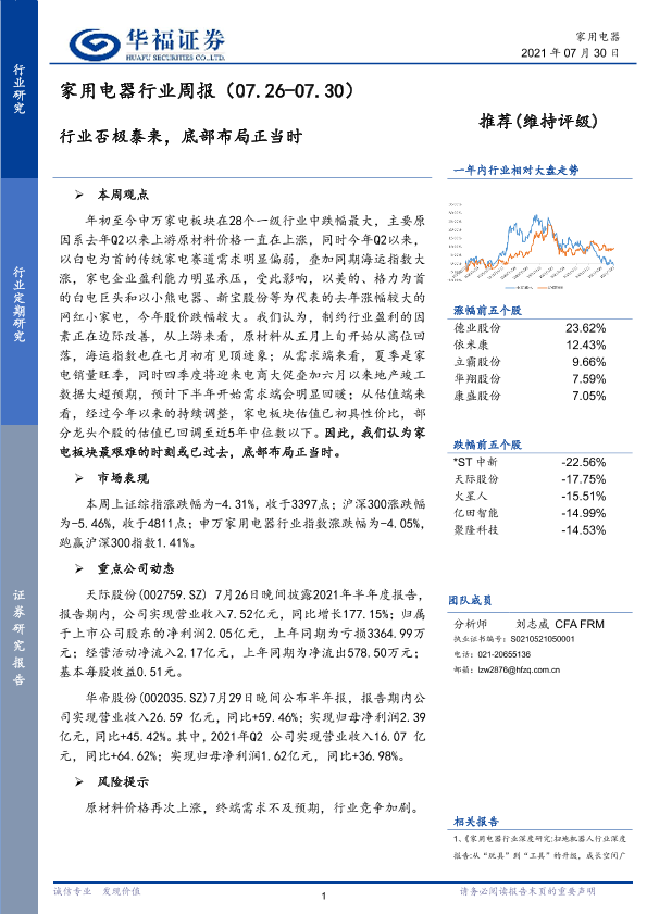 【华福证券】【20210730】家用电器行业周报:行业否极泰来,底部布局正当时-9页
