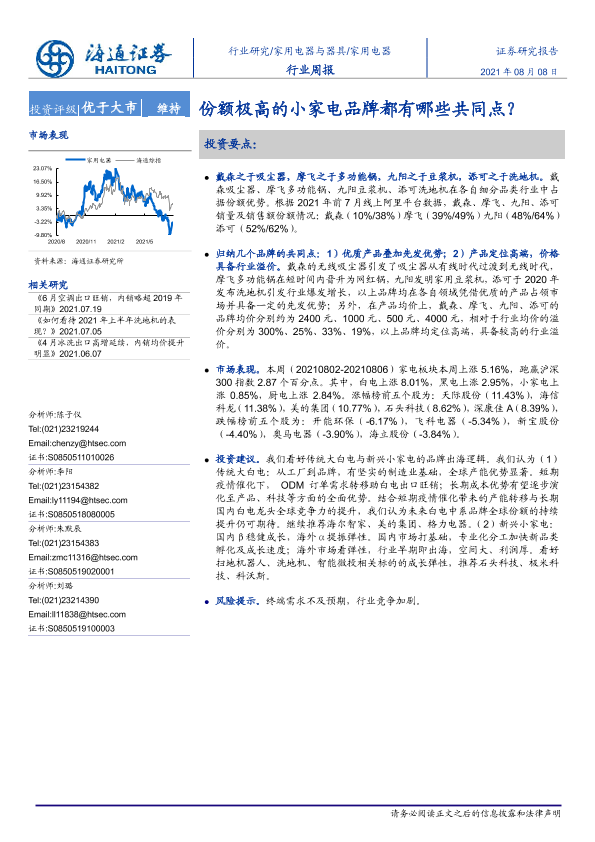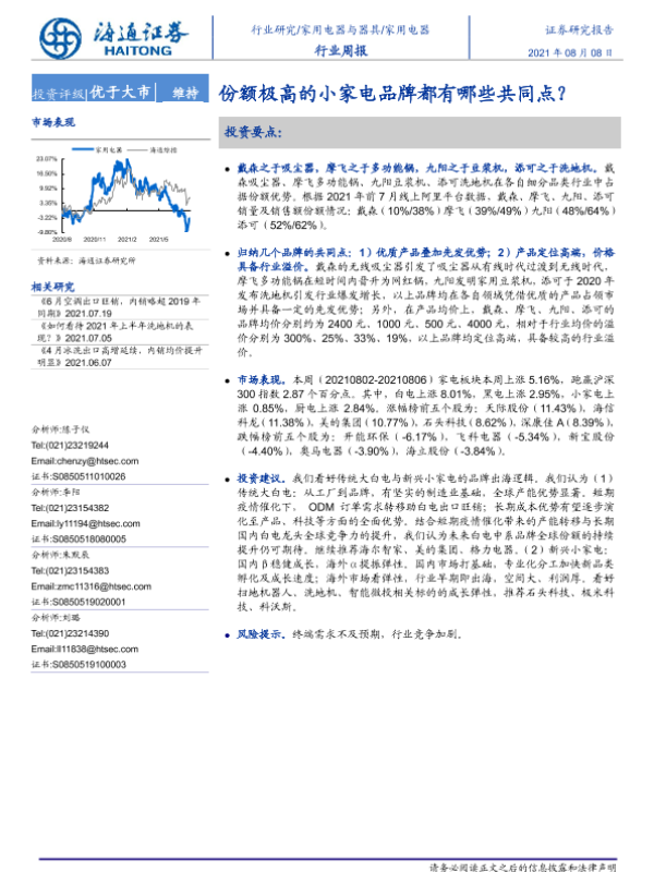 【海通证券】【20210808】家用电器行业周报:份额极高的小家电品牌都有哪些共同点?-2页