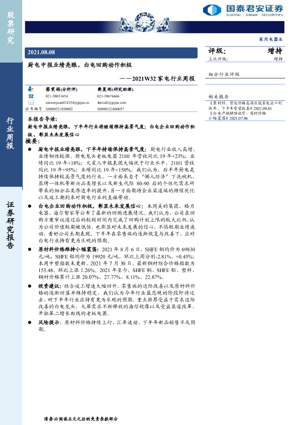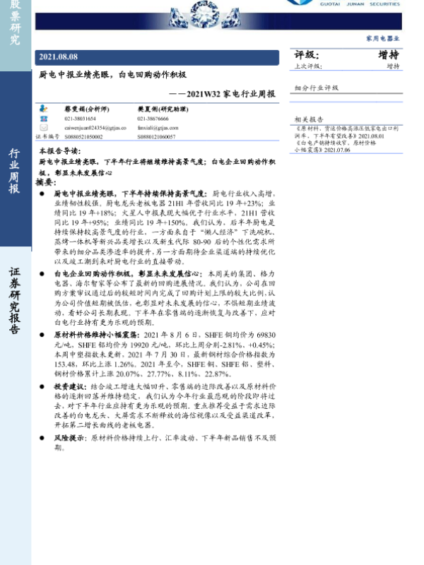 【国泰君安证券】【20210808】2021W32家电行业周报:厨电中报业绩亮眼,白电回购动作积极-10页