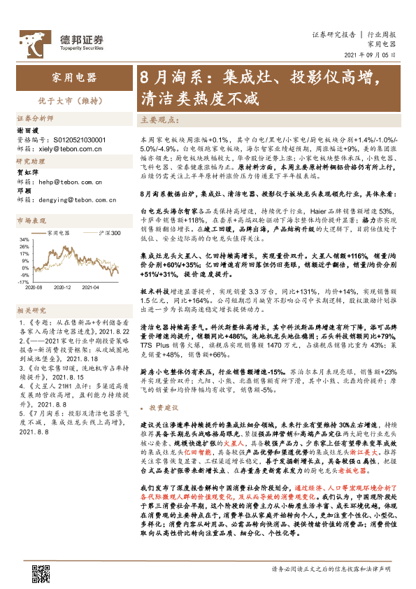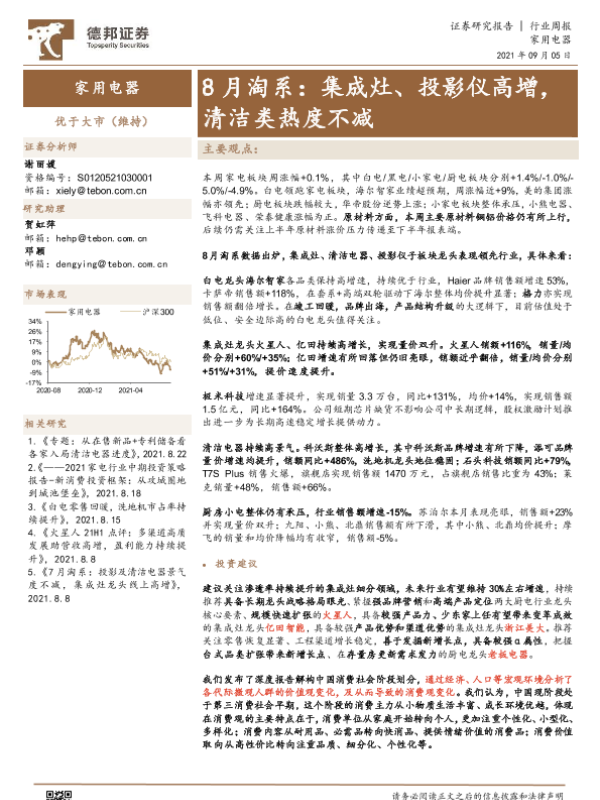 【德邦证券】【20210905】20210905-德邦证券-家用电器行业周报:8月淘系:集成灶、投影仪高增,清洁类热度不减-21页