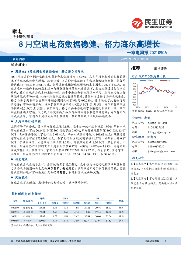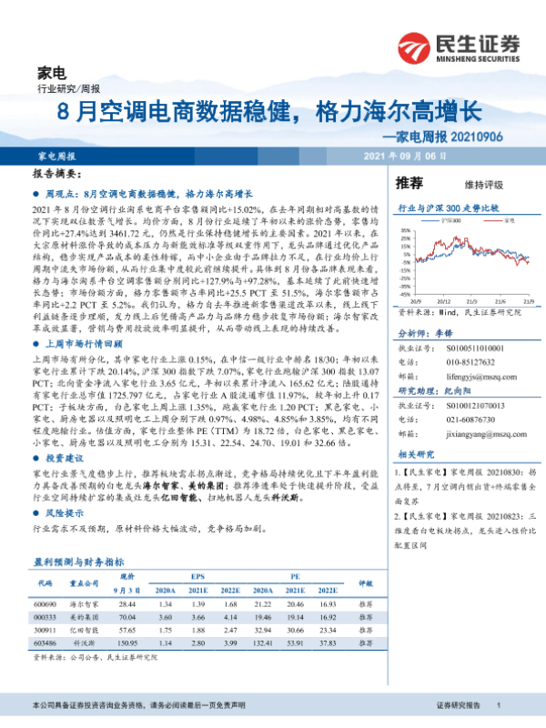 【民生证券】【20210906】家电行业周报:8月空调电商数据稳健,格力海尔高增长-15页