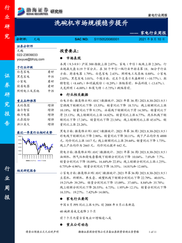 【渤海证券】【20210910】家电行业周报:洗碗机市场规模稳步提升-11页