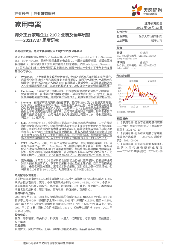 【天风证券】【20210913】家用电器行业2021W37周度研究:海外主要家电企业21Q2业绩及全年展望-22页