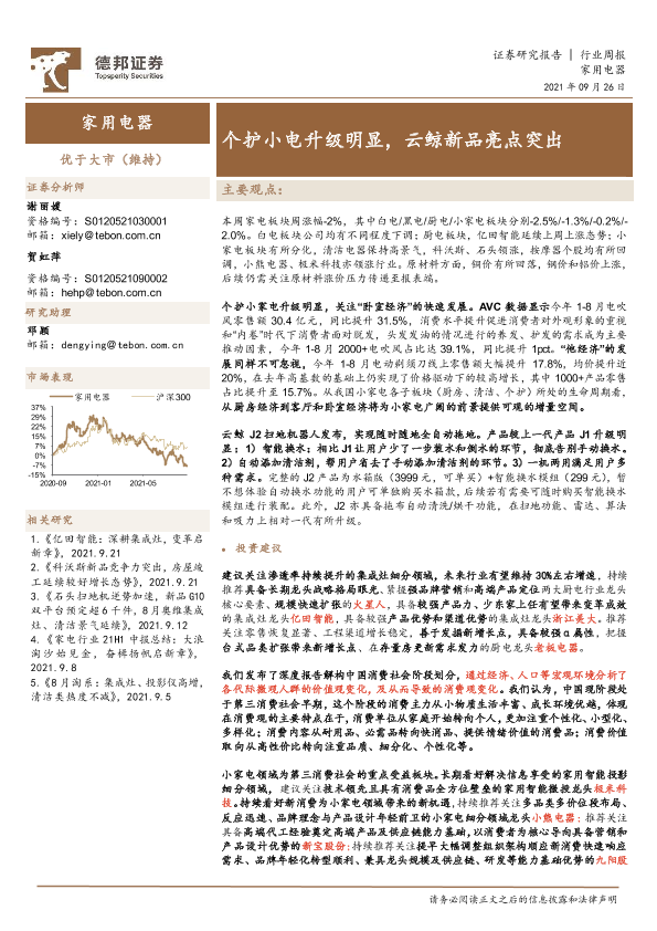 【德邦证券】【20210926】家用电器行业周报:个护小电升级明显,云鲸新品亮点突出-17页