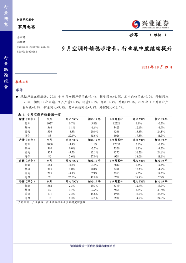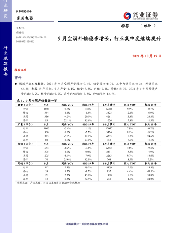 【兴业证券】【20211019】20211019-兴业证券-家用电器行业跟踪报告:9月空调外销稳步增长,行业集中度继续提升-4页