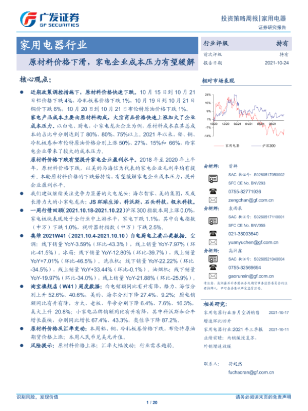 【广发证券】【20211024】家用电器行业投资策略周报:原材料价格下滑,家电企业成本压力有望缓解-20页
