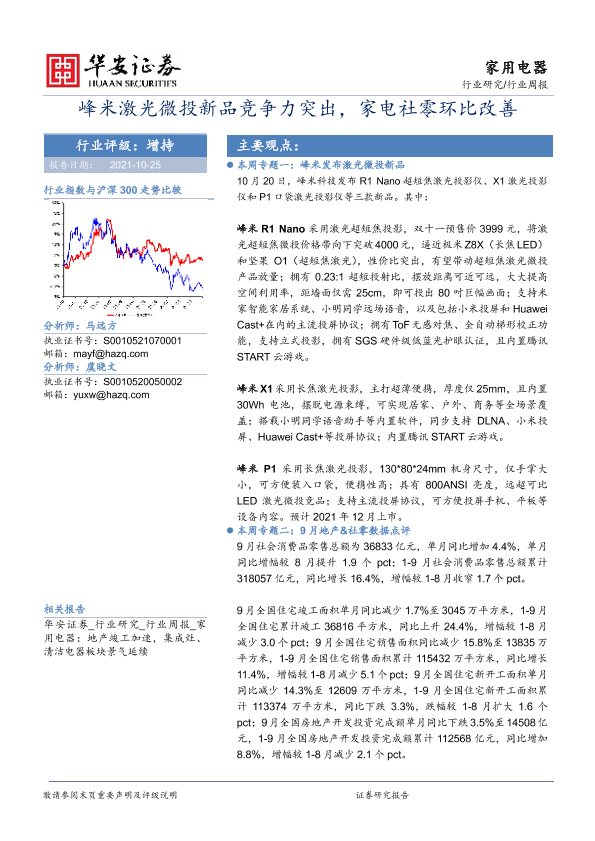 家用电器 峰米科技 房地产市场 激光微投 社零数据