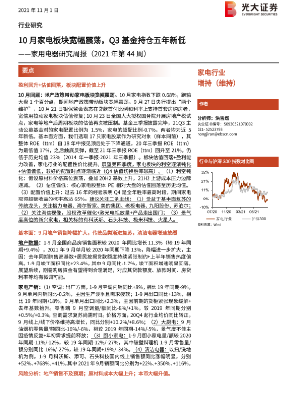 【光大证券】【20211101】20211101-光大证券-家用电器研究周报(2021年第44周):10月家电板块宽幅震荡,Q3基金持仓五年新低-27页