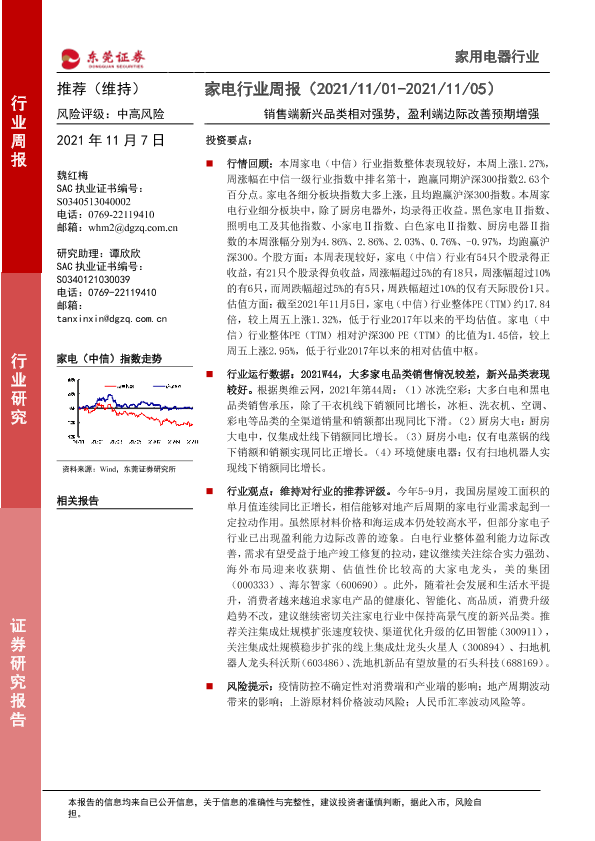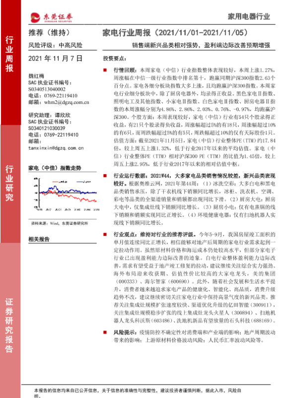 【东莞证券】【20211107】家电行业周报:销售端新兴品类相对强势,盈利端边际改善预期增强-13页